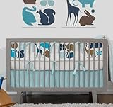 DwellStudio?Gio Aqua Crib SetWith a pattern inspired by Danish and Italian toys of the 1960s and 70s and a color palette inspired by Italian designer Gio Ponti?s interiors of a hotel in Sorrento, Italy,?Dwell's latest design lends playfulness and style to any baby?s or children?s room. The youngest fans can play make believe with Gio?s squirrel, kangaroo, snail and clover motifs. This set also features the newest 100% brushed cotton canvas?a soft, supple yet durable fabrication.Play Blanket- front in solid aqua brushed canvas, reverse in Plus Bumper- Gio in brushed canvas Fitted Sheet- Plus in cotton percale Crib Skirt- solid aqua brushed canvas ?